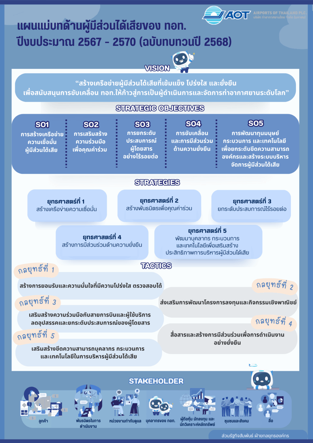 - ยกระดับความสัมพันธ์กับผู้มีส่วนได้เสียที่สำคัญ เพื่อสนับสนุนบทบาทขององค์กรในฐานะผู้ดำเนินการและจัดการท่าอากาศยานที่ดีระดับโลก