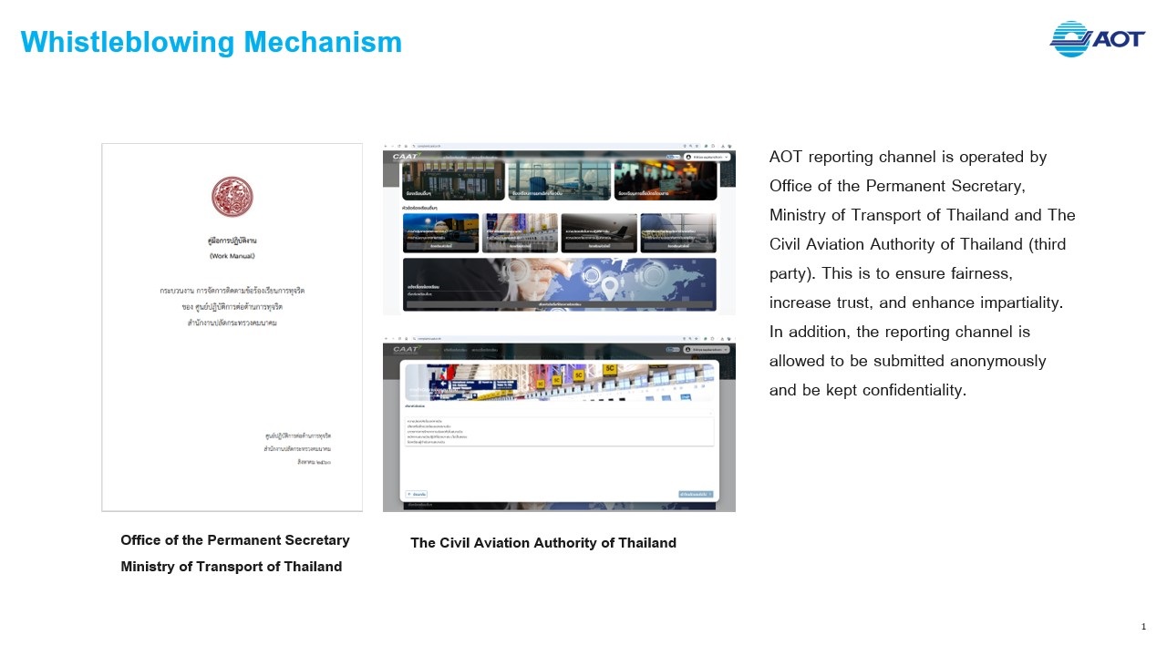 * AOT has established formal procedures for receiving complaints or whistleblower reports related to ethical conduct in operations, in order to ensure that all reported matters are properly monitored and addressed.