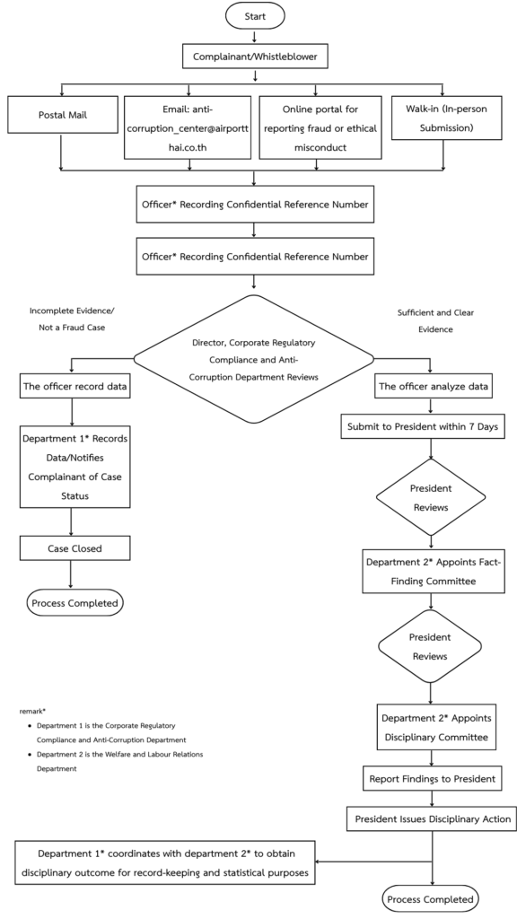 Remark: In cases where the complaint concerns the Director of the Corporate Compliance and Anti-Corruption Department, the letter should be addressed directly to the President of Airports of Thailand Public Company Limited.