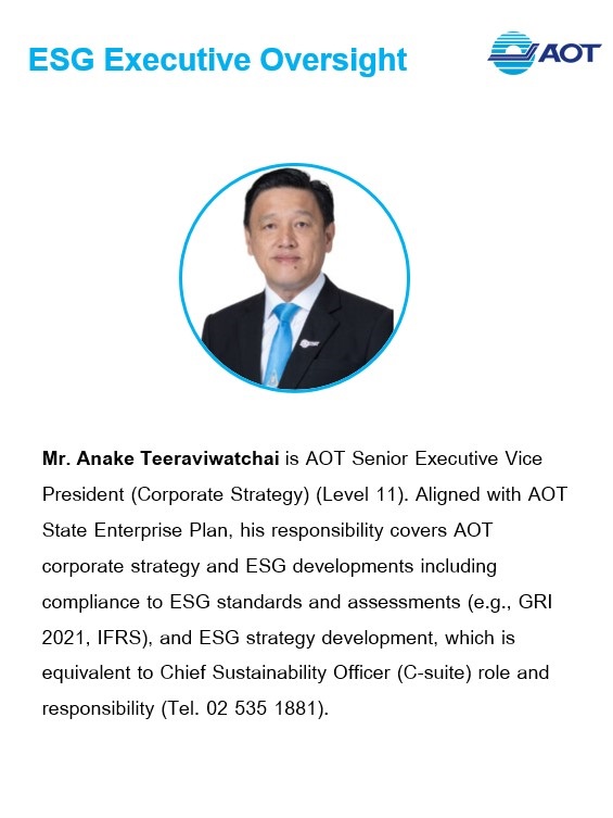 AOT implements corporate governance by referencing AOT’s governance policy and the Good Corporate Governance Manual for 2024, which aligns with the principles of the Organization for Economic Co-operation and Development (OECD) through its OECD Principles of Corporate Governance, the Principles and Guidelines for Good Corporate Governance in State Enterprises 2019, as well as international best practices according to the Corporate Sustainability Assessment (CSA) framework in the DJSI index by S&P Global and FTSE Russell by London Stock Exchange Group (LSEG), including the 10 principles of the United Nations Global Compact (UNGC). The policy outlines the code of conduct and practices for the AOT Board of Directors, encompassing comprehensive governance, social responsibility to society, communities, and the environment, equitable treatment of labor, and respect for human rights throughout AOT’s stakeholder ecosystem.