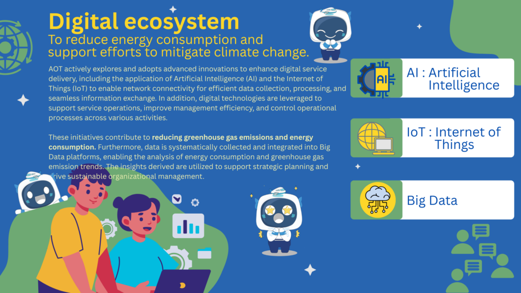 To support sustainable business growth, AOT has established the Green ICT Management Policy, which guides the selection and management of environmentally friendly information technologies across the organization.