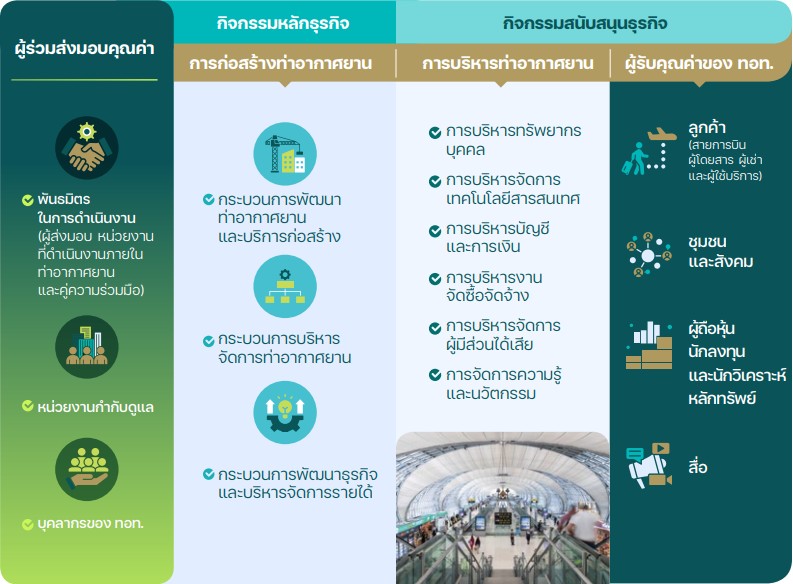 ทอท. มุ่งมั่นส่งมอบคุณค่าให้แก่ผู้มีส่วนได้เสียทุกภาคส่วนตลอดห่วงโซ่คุณค่าของธุรกิจให้บริการท่าอากาศยานตั้งแต่การออกแบบก่อสร้างท่าอากาศยาน ไปจนถึงการบริหารจัดการภายใต้หลักการสำคัญ ได้แก่